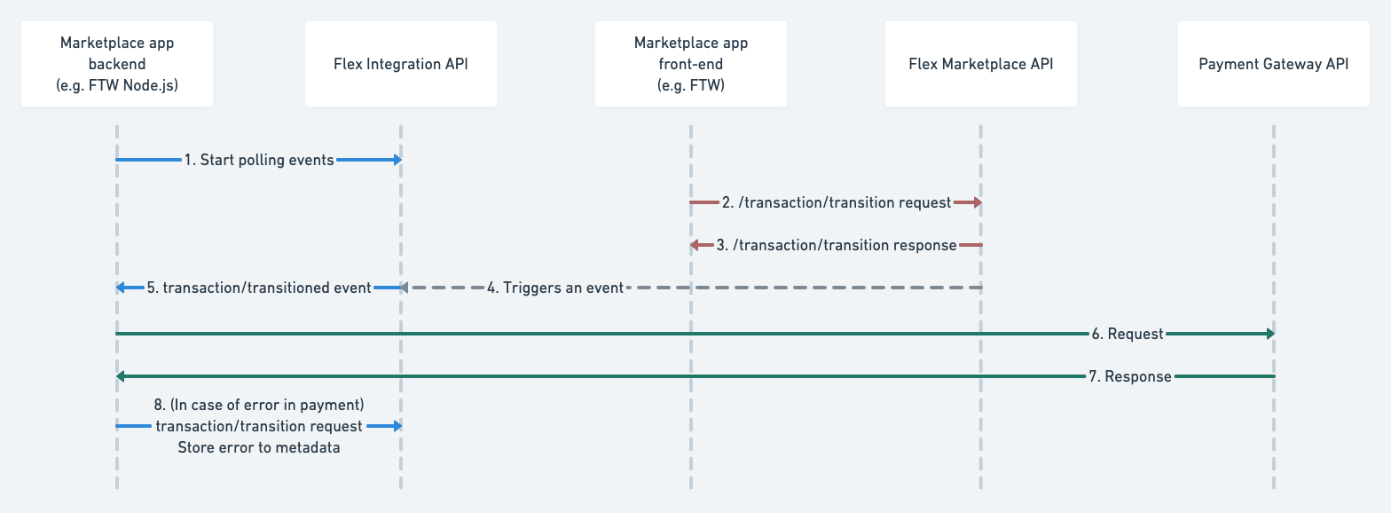 In this model, the transaction transition is done as usual. Your backend polls the events and reacts to transaction transition events by calling the payment gateway API.