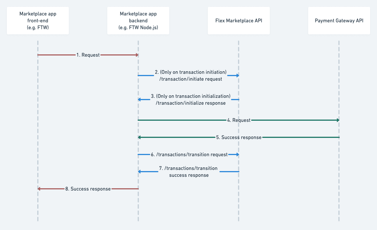 The following diagram shows the call sequence between the marketplace and the APIs. First, a user makes a transaction request using the marketplace front end, after which the backend calls the Sharetribe Marketplace API to initiate the transaction. Next, the marketplace backend calls the payment gateway's API, and finally the Sharetribe Marketplace API is called again after the payment action is completed.