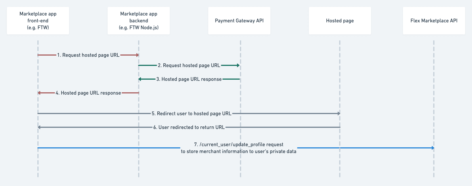 Before redirecting your user to the hosted page, your marketplace makes an API call to the payment gateway to request the URL to the hosted page. At this point, your marketplace provides the payment gateway two different return URLs: one for when a payment is completed by the user, and one for failed or canceled payment. After receiving the hosted page URL from the payment gateway, you redirect the user to that URL.