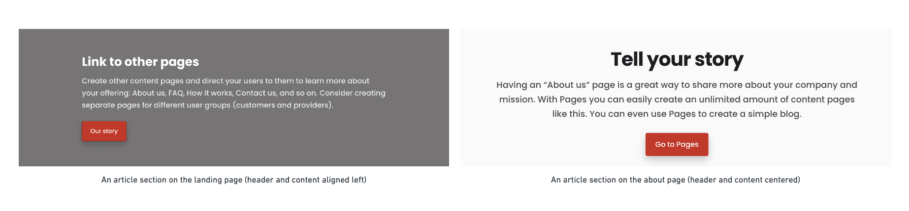 Let’s lay out a more concrete example of this scenario: say you want to define that for all Sections on the landing page using the template section-article, the title and ingress should be aligned left, and on all other pages they should adhere to the default styling, i.e. be centred: