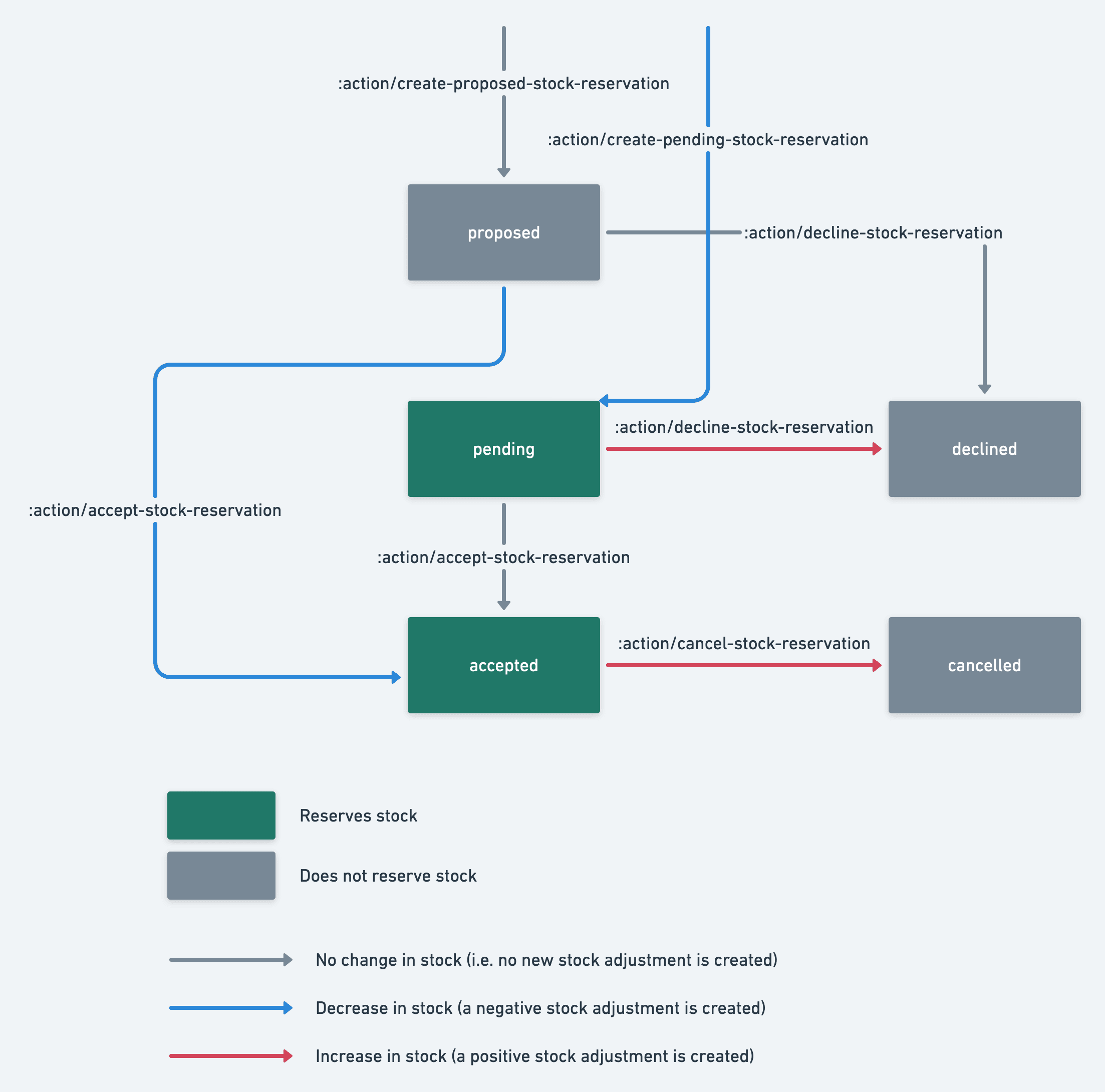 A stock reservation can be in one of several possible states: pending, proposed, accepted, cancelled or declined. Just as with bookings, stock reservations change state only through a corresponding transaction transition, using one of the stock reservation actions.